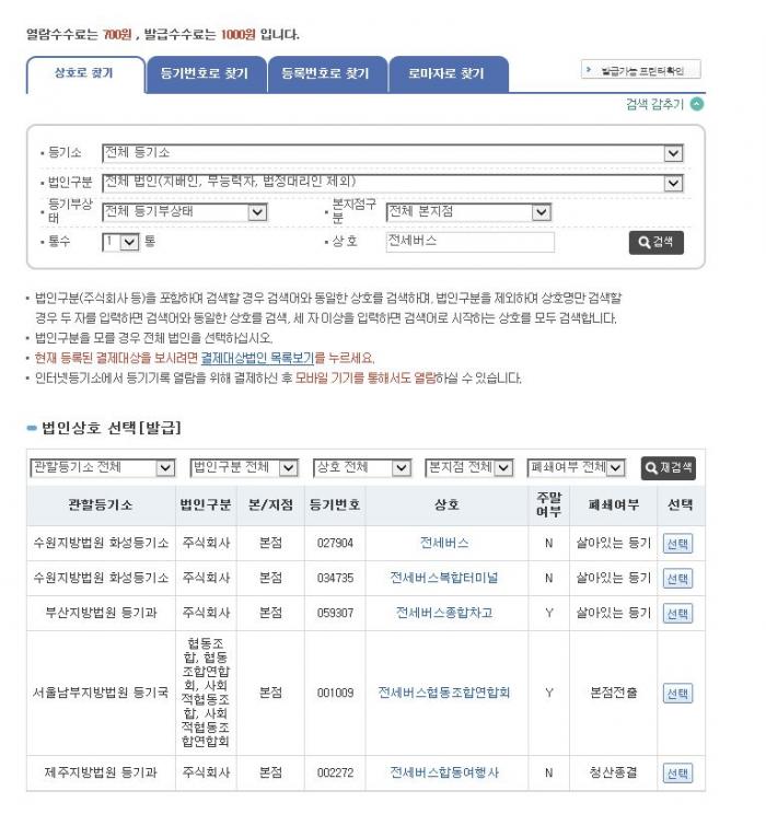 평가서 발급받고 소장 대행 접수하고 나서 전세버스공제조합의 법인등기부 등본 발급을 위해 대법원인터넷등기소에서 검색해 보면